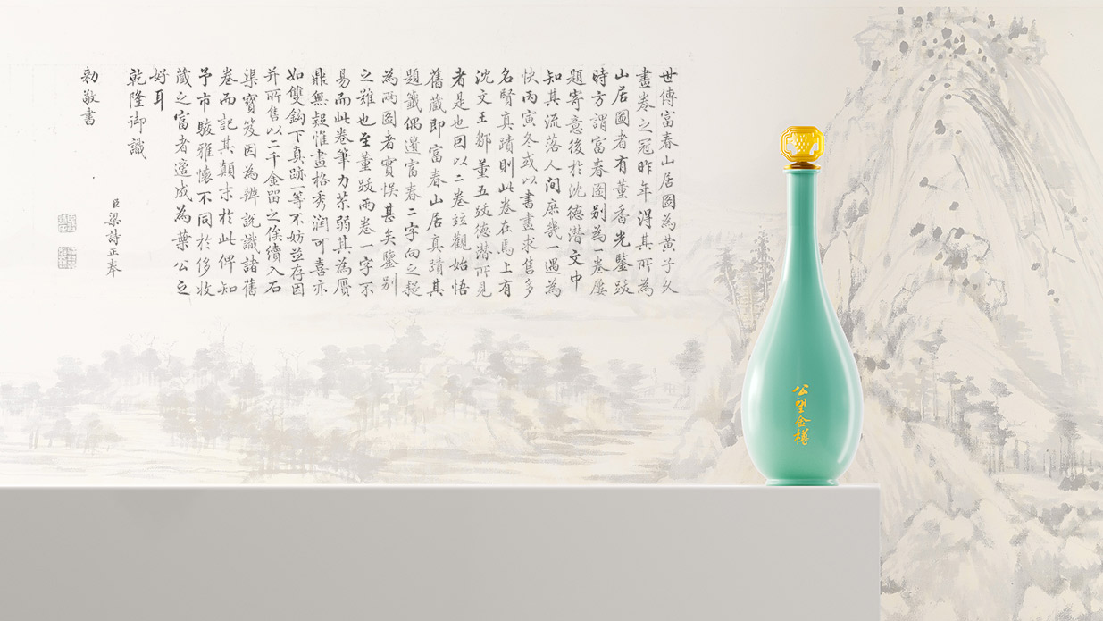 在瓶身设计上,我们采用了龙泉青瓷工艺,其造型借鉴了经典的观音瓶。观音瓶线条流畅、比例协调,自古以来就被视为高贵典雅的象征。龙泉青瓷以其温润如玉的质感和清新的色泽闻名于世,与公望白酒的高品质形象相得益彰。这种设计不仅体现了产品的高端定位,更将江南地区的地域文化融入其中,让消费者在品鉴美酒的同时,也能感受到深厚的文化底蕴。