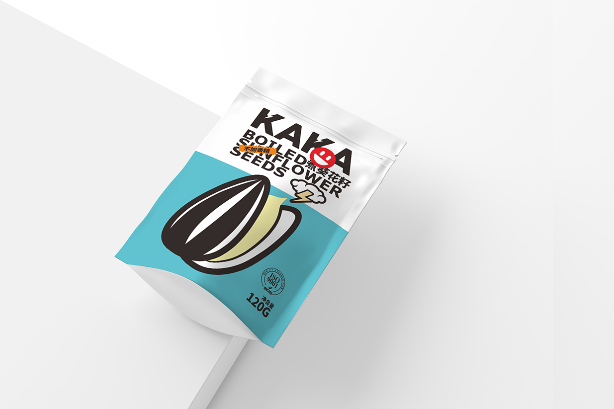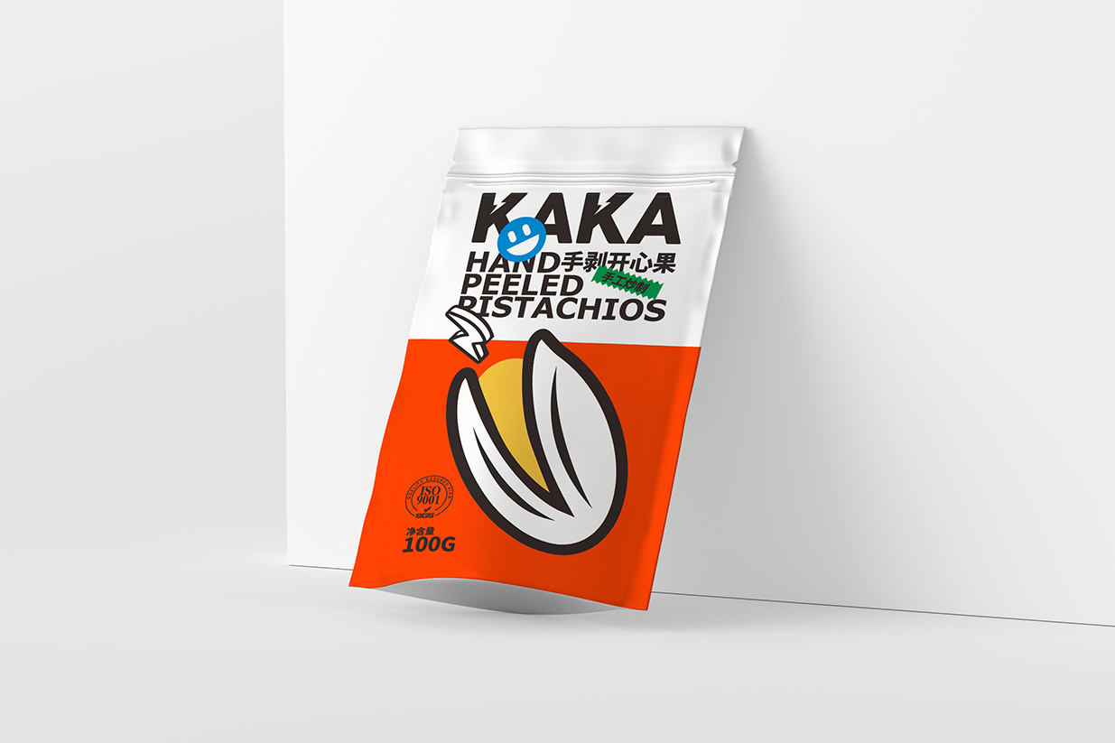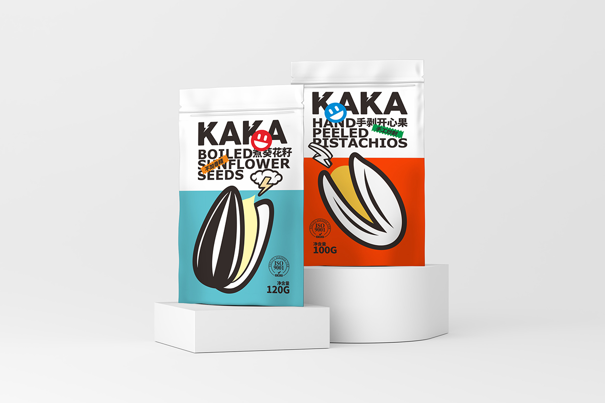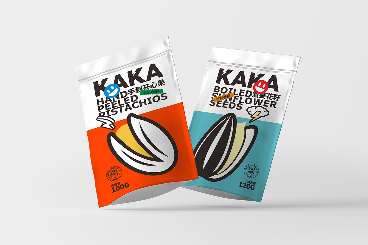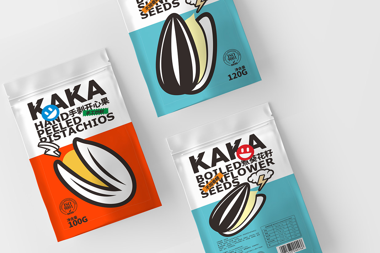 Item Kaka坚果包装设计 content:包装设计 Introduction:在Kaka坚果包装设计中,我们运用了波普风格的典型元素,如几何图形、夸张的色彩和简洁的线条,使包装呈现出年轻、时尚的气息。黑色英文品名结合表情贴纸,增加包装的互动性和趣味性传递出Kaka品牌年轻、活力、高品质的形象特点。
