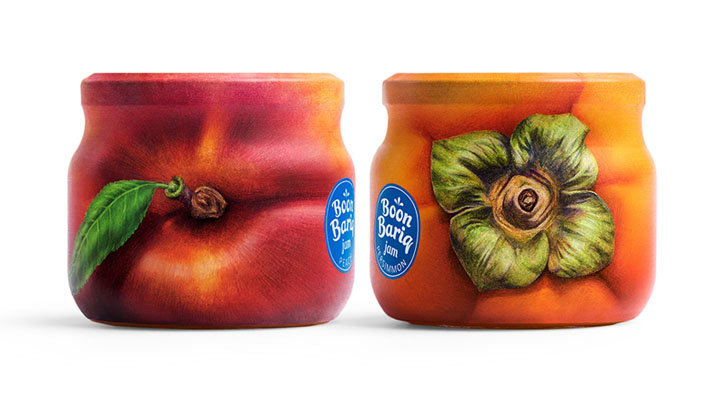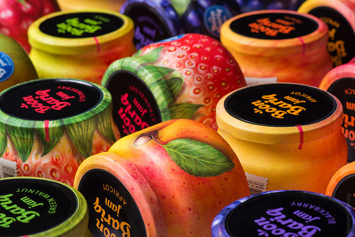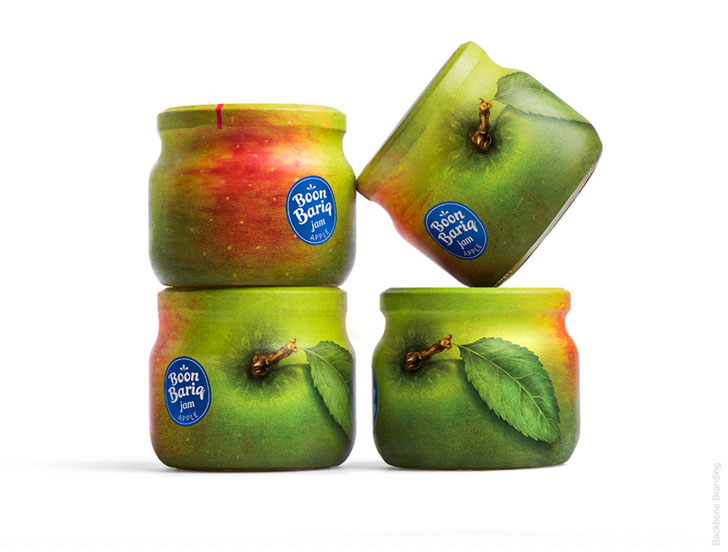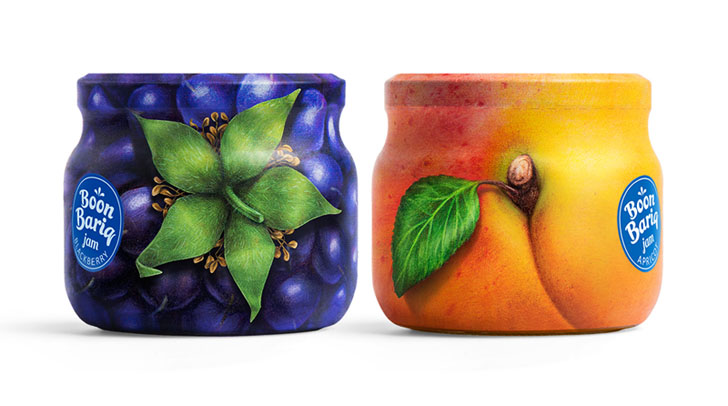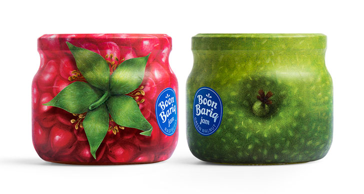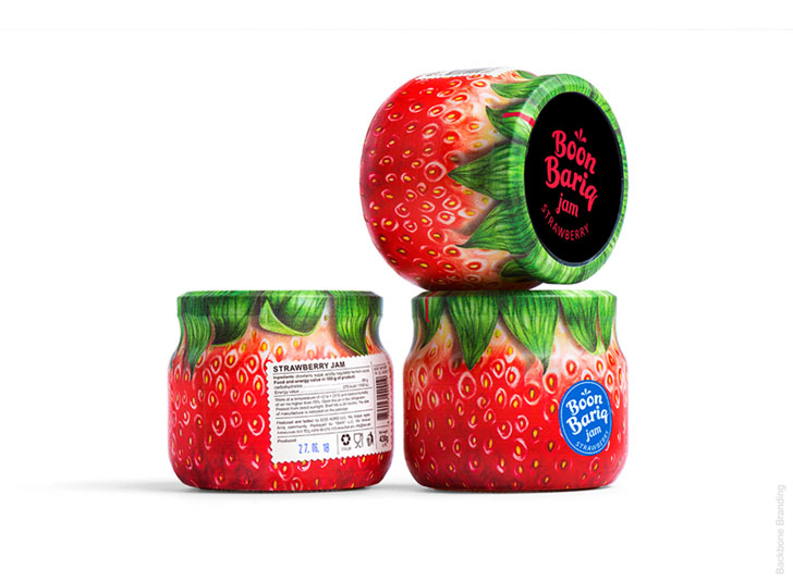 Boon Bariq考虑到果脯细分市场的激烈竞争,必须打造一款特别的产品来突破。他们开发了一种新的水果保鲜配方,并从特选的果园中采集了产品。为了使其产品与竞争对手区分开来,决定在他的食谱中使用更多的天然成分,其中水果和浆果的比例更高。同时,Boon Bariq也希望在品牌理念和产品的外包装设计中表达这些优势。设计师通过研究多种说明水果和标签设计的方法,我们发现许多品牌使用四分之一或一半的罐子表面来说明水果并展示品牌信息。最后为了最好地传达罐中水果和浆果的高比例,想出了一个简单的解决方案:用果皮包裹整个罐子。