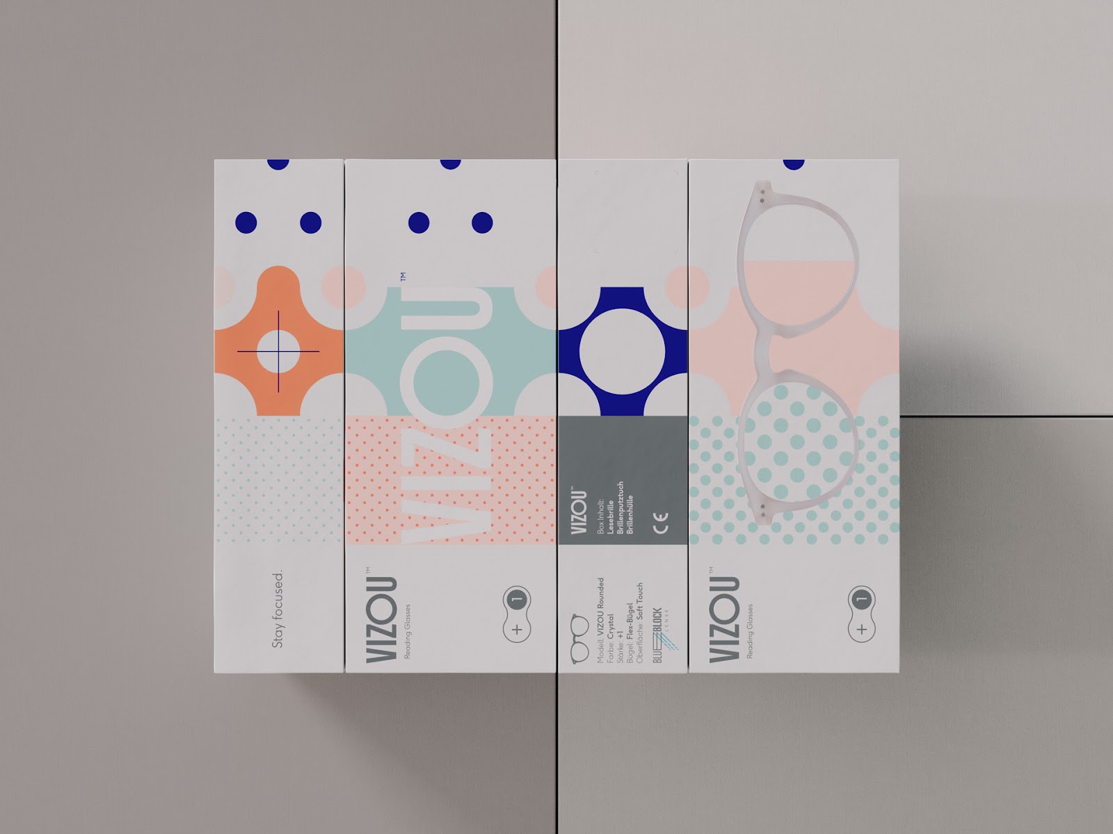 设计师希望表现产品享受每个细节-阅读的新乐趣这一理念。根据各个眼镜模型的屈光度,形式和色调而变化,设计师用图形化的方式加以表达,呈现出与众不同的视觉效果。