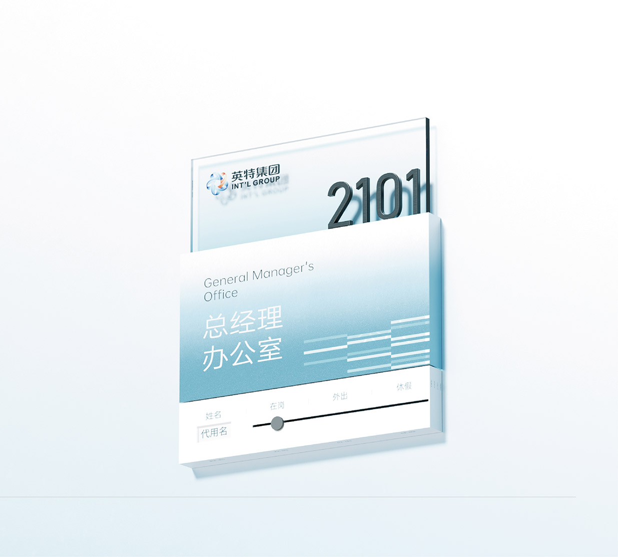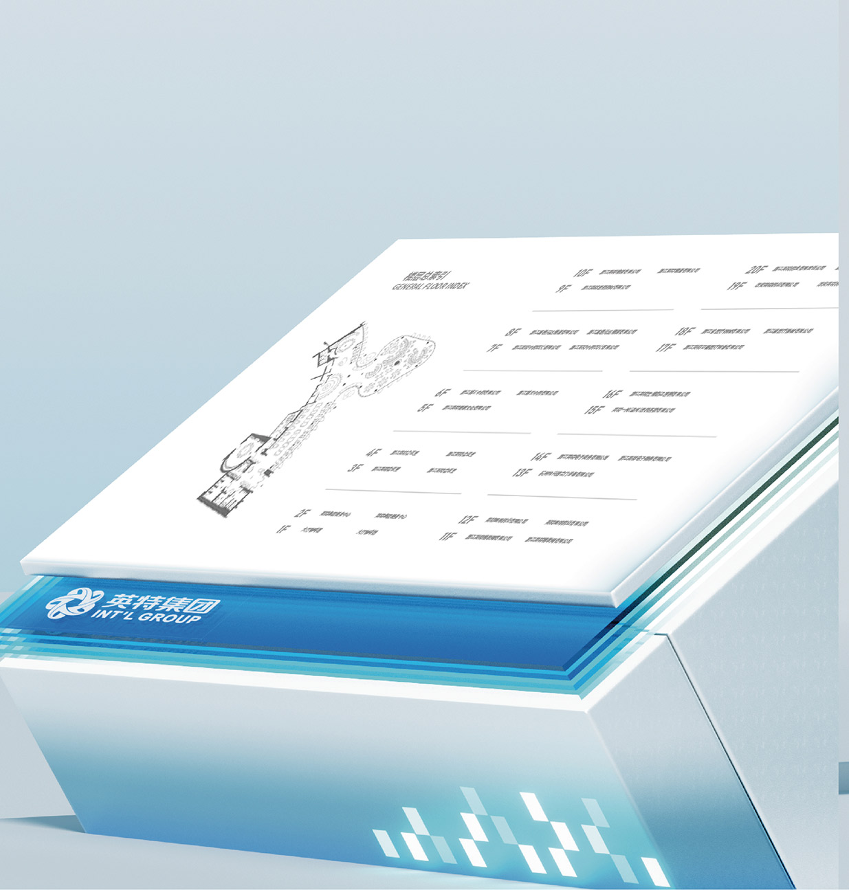 选择蓝色作为品牌主色调,蓝色在色彩心理学中常常与智慧、科技、冷静以及可靠性等特质紧密相连。在医药行业,这些特质尤为重要,因为它们能够传递出英特集团在医药科技研发、创新应用以及精准服务方面的专业形象。同时,纵向线段的设计元素巧妙地融入其中,这些线条象征着数据传输、信息流动以及科技发展的方向性。它们以简洁而富有节奏感的排列方式,展现出英特集团在医药供应链管理、药品信息追溯以及数字化医疗服务等方面所具备的高效、精准的科技实力,让客户直观地感受到企业与前沿科技紧密相连的品牌形象。大量使用玻璃材质是本次品牌形象升级的另一大亮点。玻璃以其透明、光滑、质感高级的特性,完美地诠释了现代感。