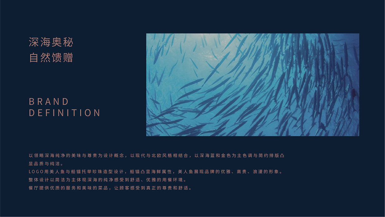 Introduction:深海奥秘:领略纯净美味与尊贵自然赋予的宝藏,深海的奥秘,是我们品牌设计的灵感源泉。我们希望通过现代与北欧风格的独特结合,为您描绘出深海纯净、尊贵的美味世界。深海蓝与金色的主色调,象征着深海的广袤与丰富,同时也传递出我们品牌的高贵与优雅。简约的排版风格,使整个设计更显纯粹与品质,凸显我们产品的纯洁与安全。我们的LOGO设计灵感来源于美人鱼与船锚。船锚是海洋的象征,代表着我们品牌的海鲜属性。而美人鱼则代表着品牌的优雅、高贵与浪漫,同时也是我们对美好生活的追求。两者共同托举着珍珠造型,犹如一幅美丽的海洋画卷,展现出品牌的尊贵与独特。整体设计以简洁为主,体现出深海的纯净与广阔。我们希望每一位顾客在享用美食的同时,也能感受到我们对品质的追求和对环境的尊重。优质的服务和美味的菜品,是我们对每位顾客的承诺。我们希望通过我们的努力,让每一位顾客都能感受到真正的尊贵和舒适。