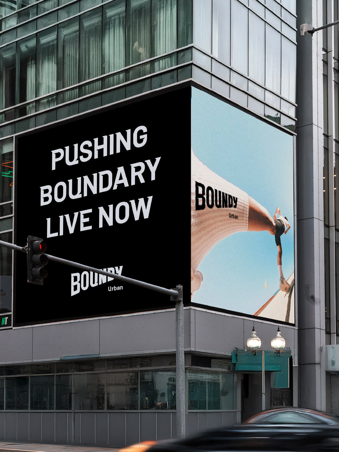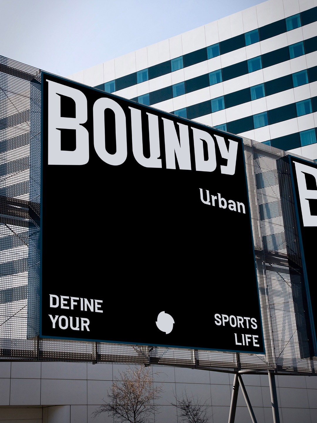 品牌标志设计核心符号:以品牌名称“BOUNDY”为主体,通过厚重字体与透视结构强化视觉冲击力。字体棱角分明,倾斜的透视造型体现动态感与力量延伸感。