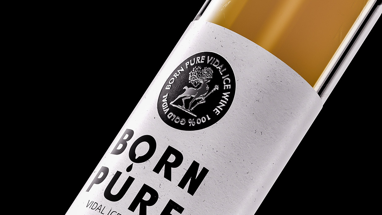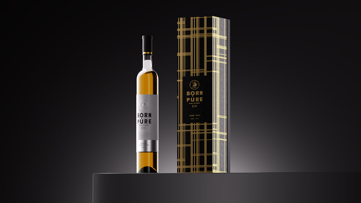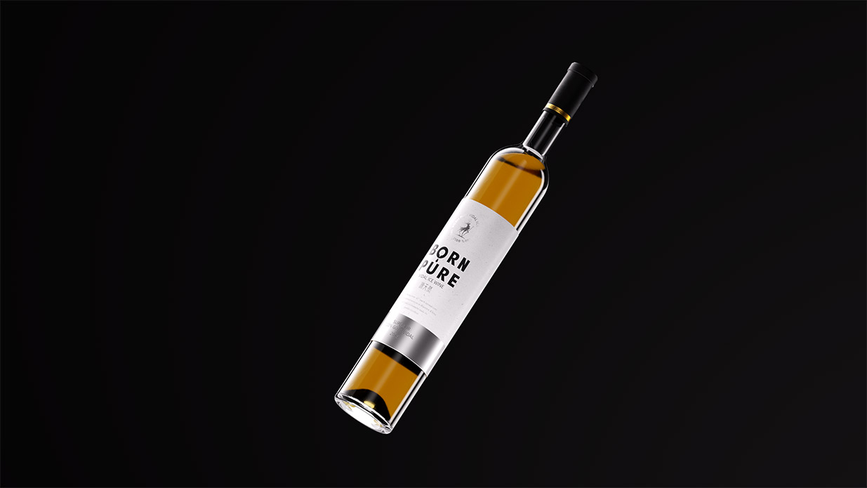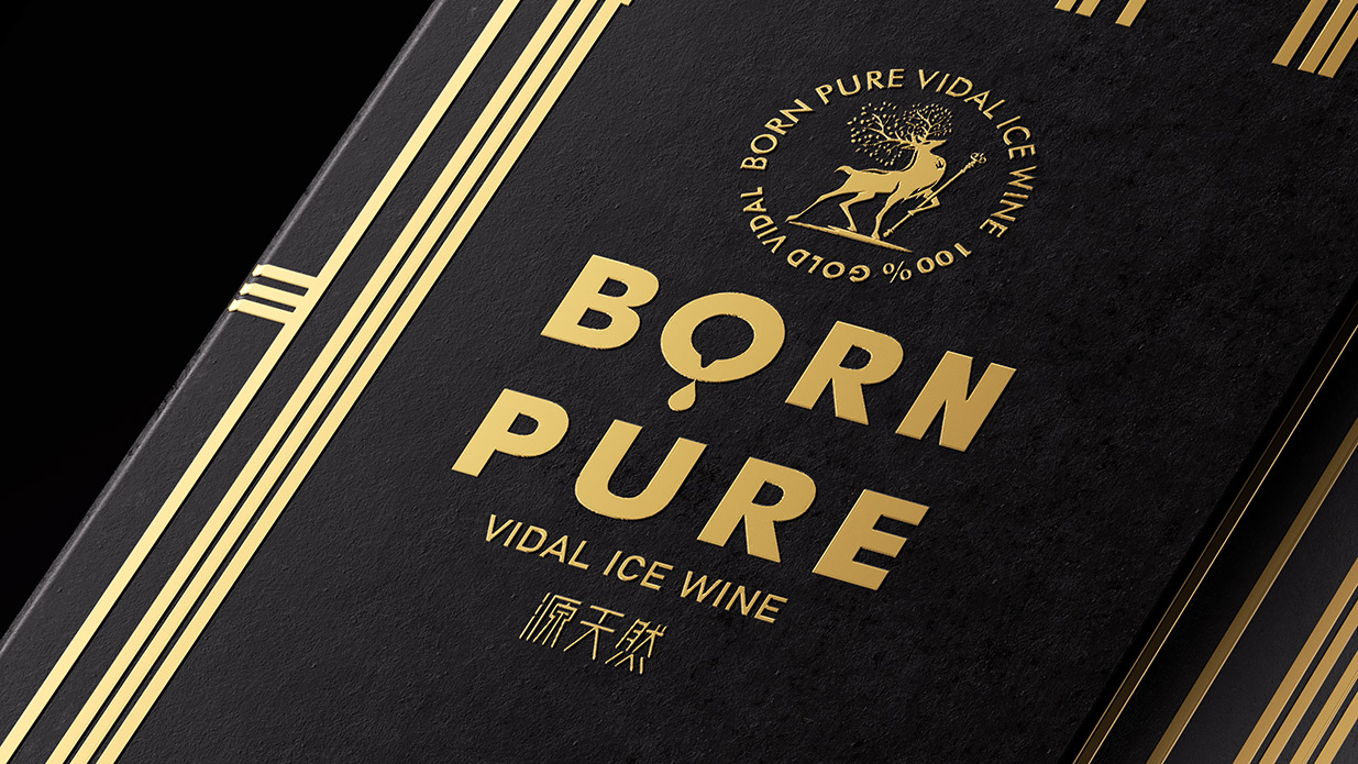 Item BORN PURE 冰酒设计 BORN PURE 冰酒源自北纬41°桓龙湖畔,世界冰葡萄酒产区的源天然冰酒,选用优质威代尔冰葡萄,经过传统的工艺发酵,酿出的冰酒酒体金黄,醇透晶亮,香气馥郁。包装形象设计取材辽宁特色动物鹿为原型,通过设计提炼,赋予其神秘的故事感,源天然英文寓意“”天生冰纯“,很精准的体现了冰酒的质感。