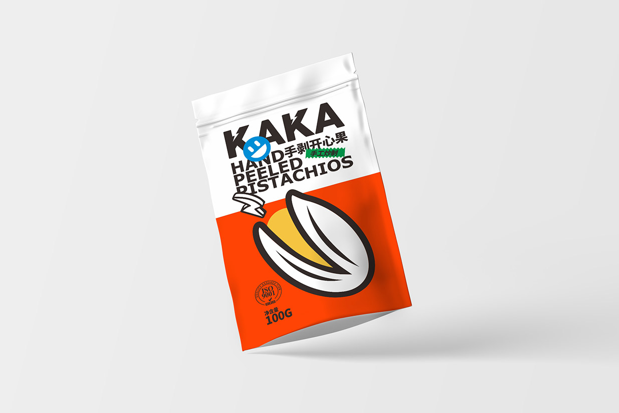 Item Kaka坚果包装设计 content:包装设计 Introduction:在Kaka坚果包装设计中,我们运用了波普风格的典型元素,如几何图形、夸张的色彩和简洁的线条,使包装呈现出年轻、时尚的气息。黑色英文品名结合表情贴纸,增加包装的互动性和趣味性传递出Kaka品牌年轻、活力、高品质的形象特点。