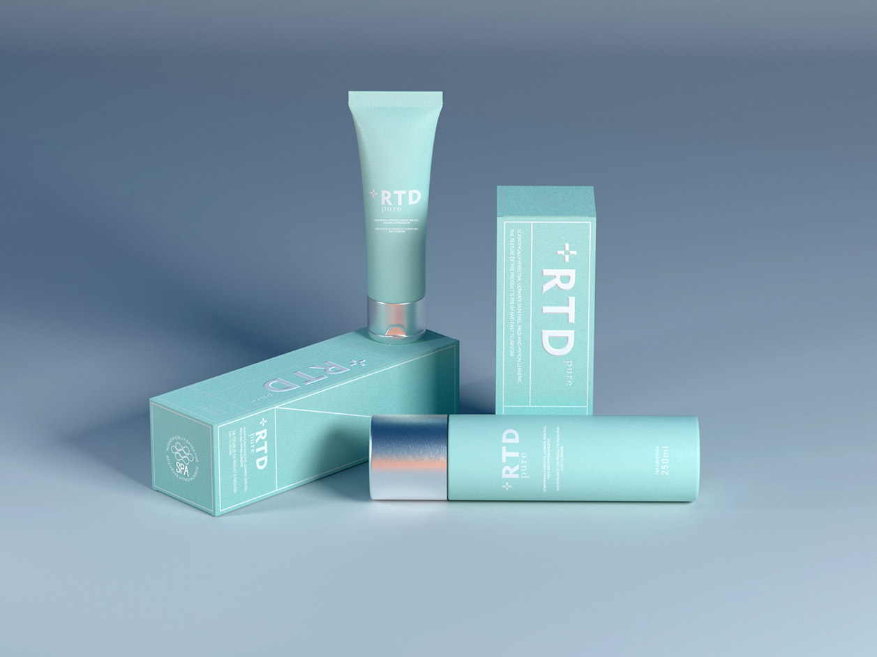 Item RTD护肤品包装设计 content:包装设计 Introduction:RTD护肤品包装以淡淡的蓝绿色为主色调,表达了产品的纯净与自然之美。我们的设计理念是将产品的内在质量与外在美感完美结合,让人联想到清澈的湖水、翠绿的山林,从而传达出RTD护肤品天然、温和、无添加的品质。 RTD护肤品的包装采用了环保再生纸张,确保包装对环境的影响降到最低。logo采用了浮雕工艺,使得品牌标志更具立体感,以简洁的线条和独特的造型,传达出品牌纯净与自然之美。