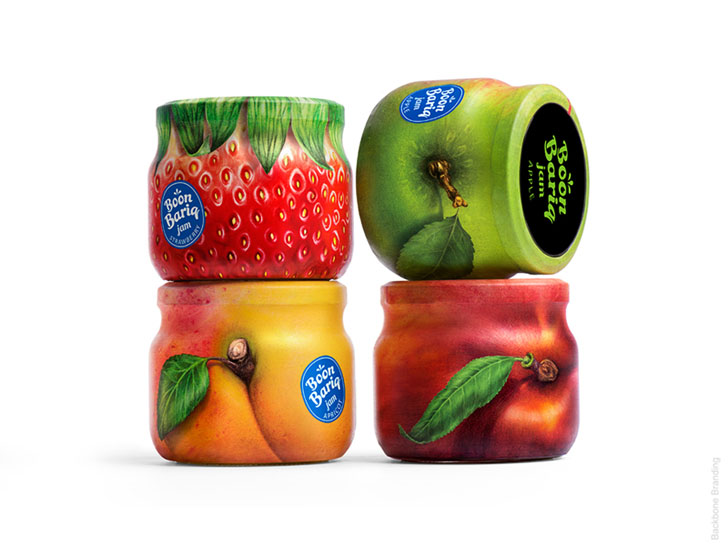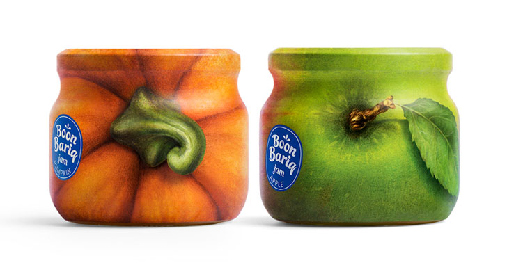Boon Bariq考虑到果脯细分市场的激烈竞争,必须打造一款特别的产品来突破。他们开发了一种新的水果保鲜配方,并从特选的果园中采集了产品。为了使其产品与竞争对手区分开来,决定在他的食谱中使用更多的天然成分,其中水果和浆果的比例更高。同时,Boon Bariq也希望在品牌理念和产品的外包装设计中表达这些优势。设计师通过研究多种说明水果和标签设计的方法,我们发现许多品牌使用四分之一或一半的罐子表面来说明水果并展示品牌信息。最后为了最好地传达罐中水果和浆果的高比例,想出了一个简单的解决方案:用果皮包裹整个罐子。