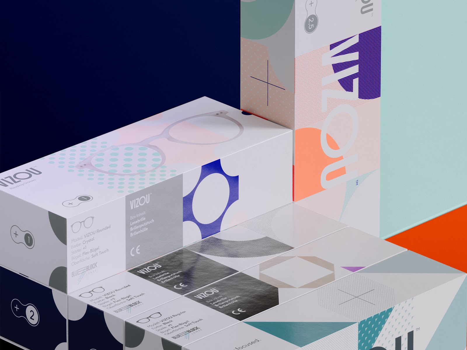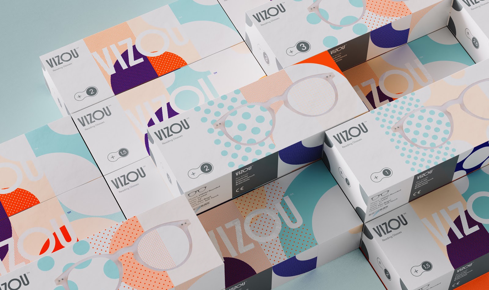 设计师希望表现产品享受每个细节-阅读的新乐趣这一理念。根据各个眼镜模型的屈光度,形式和色调而变化,设计师用图形化的方式加以表达,呈现出与众不同的视觉效果。