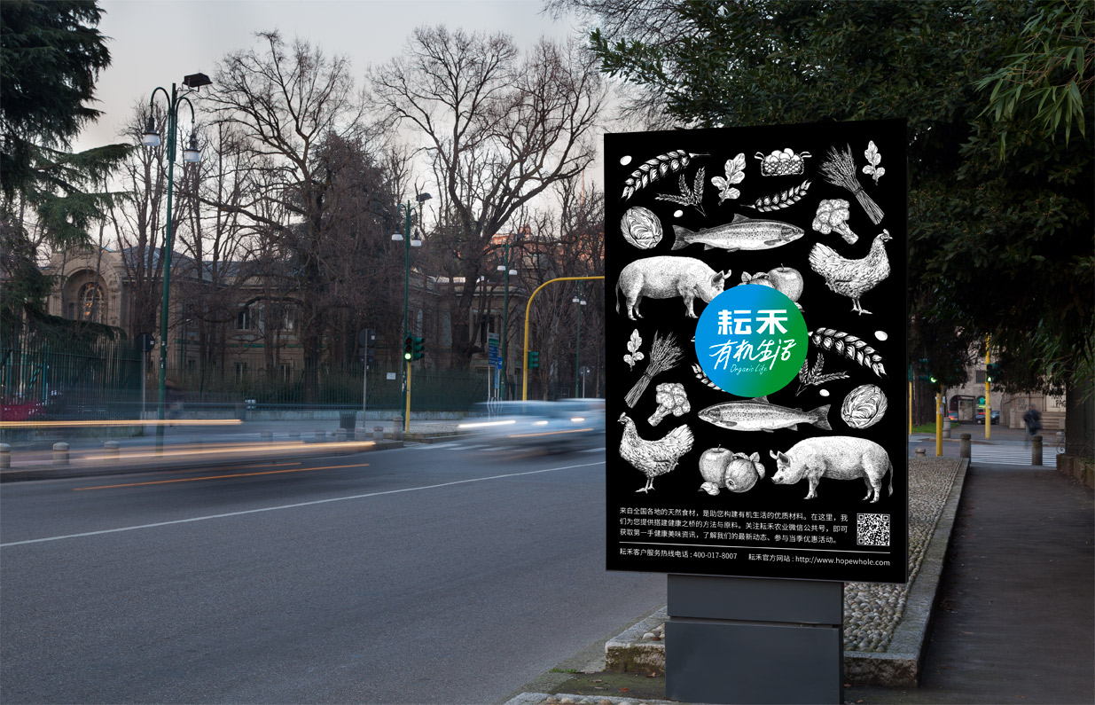 耘禾有机生活致力于打造从基地到餐桌的农产品生态链,以传统经验为基础的施肥灌溉和病虫防治技术,小规模耕作,以期生产出富有自然气息和阳光味道的农产品,为客户提供可信赖的优质食材, 满足人们对健康生活方式的追求。 品牌形象设计纯真质朴,以黑色衬托自然的颜色,以黑色凸显品牌符号,提升品牌识别度。