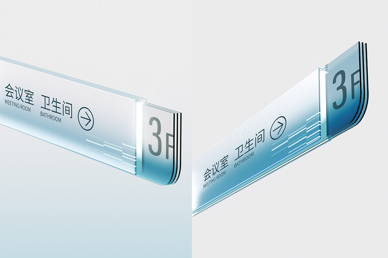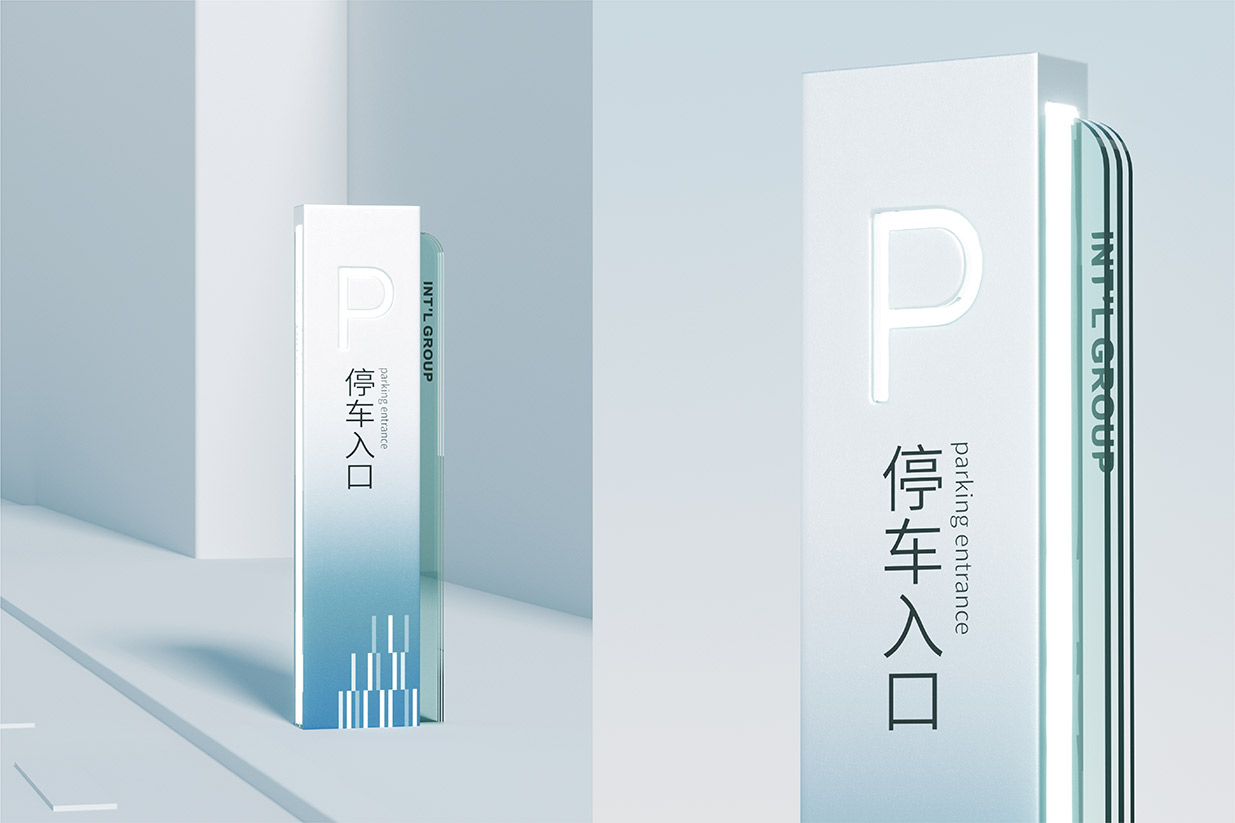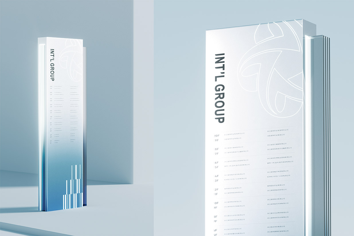 选择蓝色作为品牌主色调,蓝色在色彩心理学中常常与智慧、科技、冷静以及可靠性等特质紧密相连。在医药行业,这些特质尤为重要,因为它们能够传递出英特集团在医药科技研发、创新应用以及精准服务方面的专业形象。同时,纵向线段的设计元素巧妙地融入其中,这些线条象征着数据传输、信息流动以及科技发展的方向性。它们以简洁而富有节奏感的排列方式,展现出英特集团在医药供应链管理、药品信息追溯以及数字化医疗服务等方面所具备的高效、精准的科技实力,让客户直观地感受到企业与前沿科技紧密相连的品牌形象。大量使用玻璃材质是本次品牌形象升级的另一大亮点。玻璃以其透明、光滑、质感高级的特性,完美地诠释了现代感。