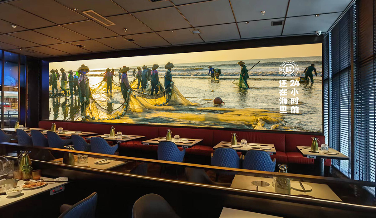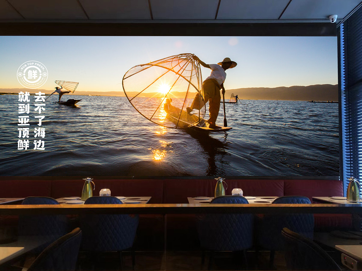 品牌主画面描绘了晚霞中勤劳的渔民驾着渔船缓缓靠岸的场景,浓郁的海洋气息扑面而来,让人仿佛置身于海洋之中。搭配蓝色深邃的海底世界悬吊灯箱和悠游的洁白水母,让顾客在品尝美食的同时,也能感受到餐厅独特的品牌魅力。