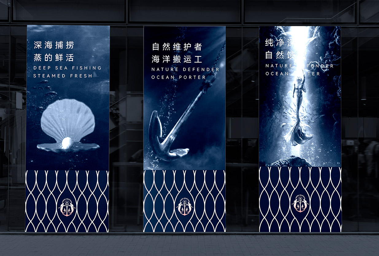 Introduction:深海奥秘:领略纯净美味与尊贵自然赋予的宝藏,深海的奥秘,是我们品牌设计的灵感源泉。我们希望通过现代与北欧风格的独特结合,为您描绘出深海纯净、尊贵的美味世界。深海蓝与金色的主色调,象征着深海的广袤与丰富,同时也传递出我们品牌的高贵与优雅。简约的排版风格,使整个设计更显纯粹与品质,凸显我们产品的纯洁与安全。我们的LOGO设计灵感来源于美人鱼与船锚。船锚是海洋的象征,代表着我们品牌的海鲜属性。而美人鱼则代表着品牌的优雅、高贵与浪漫,同时也是我们对美好生活的追求。两者共同托举着珍珠造型,犹如一幅美丽的海洋画卷,展现出品牌的尊贵与独特。整体设计以简洁为主,体现出深海的纯净与广阔。我们希望每一位顾客在享用美食的同时,也能感受到我们对品质的追求和对环境的尊重。优质的服务和美味的菜品,是我们对每位顾客的承诺。我们希望通过我们的努力,让每一位顾客都能感受到真正的尊贵和舒适。
